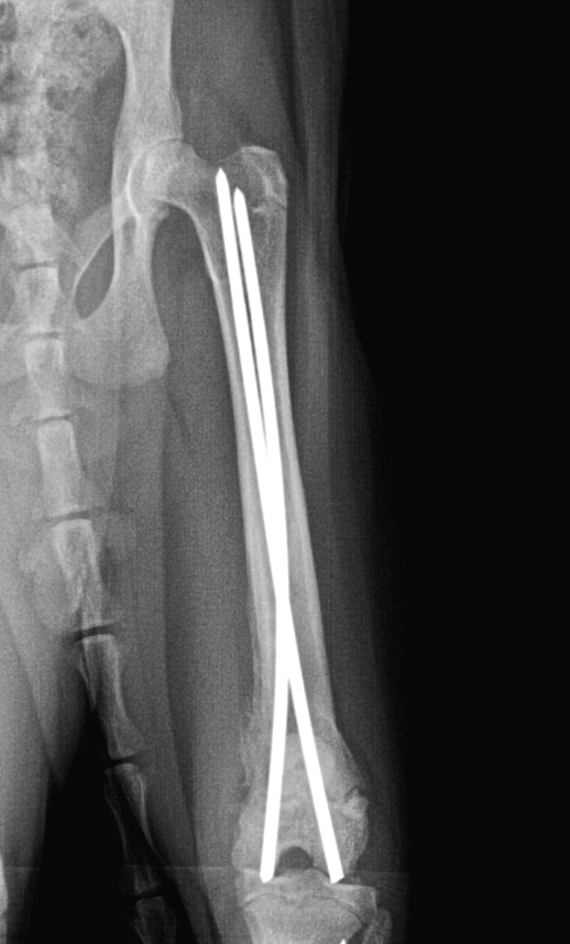 Fixation with pins | Metal rods inserted through the bone or into the medullary cavity | Straighten and temporarily hold a simple fracture. Fix a small fragment. Fracture near a joint | Diaphyseal fracture in a young animal. Articular fracture |